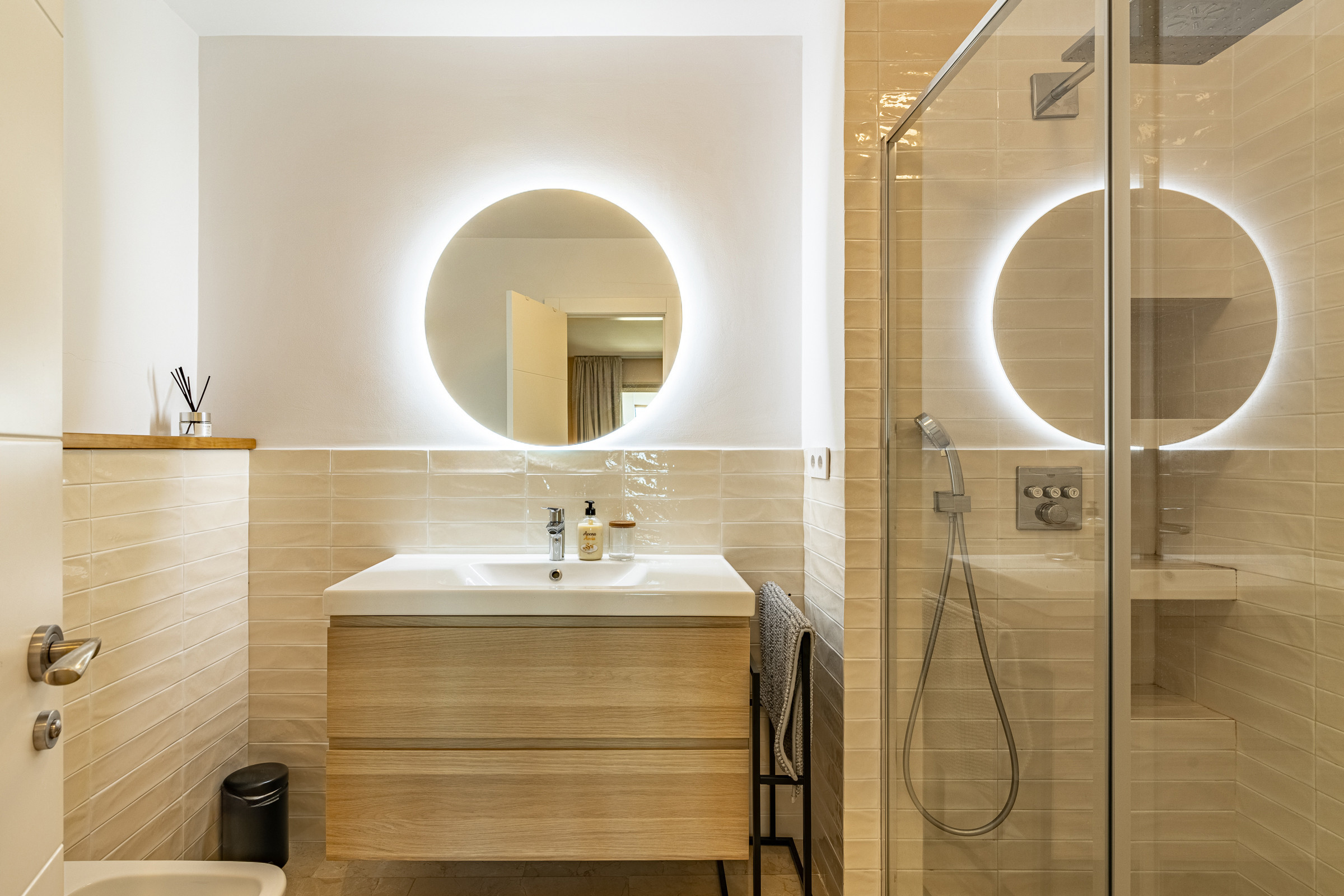 El dormitorio principal tiene cama de matrimonio y un cuarto de baño ensuite con bañera y doble lavabo, y los otros dos dormitorios ofrecen dos camas individuales cada uno y comparten otro baño con ducha. Todos los dormitorios ofrecen armarios empotrados y el dormitorio principal tiene acceso directo a la terraza.