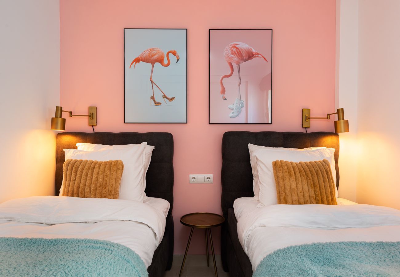 The apartment features two colourful large bedrooms and two bathrooms. The master bedroom offers a king size bed and an ensuite bathroom with bathtub and double sink, and the second room has two single beds and a bathroom with shower. The two bedrooms offer built-in closets and the master bedroom has direct access to the terrace.