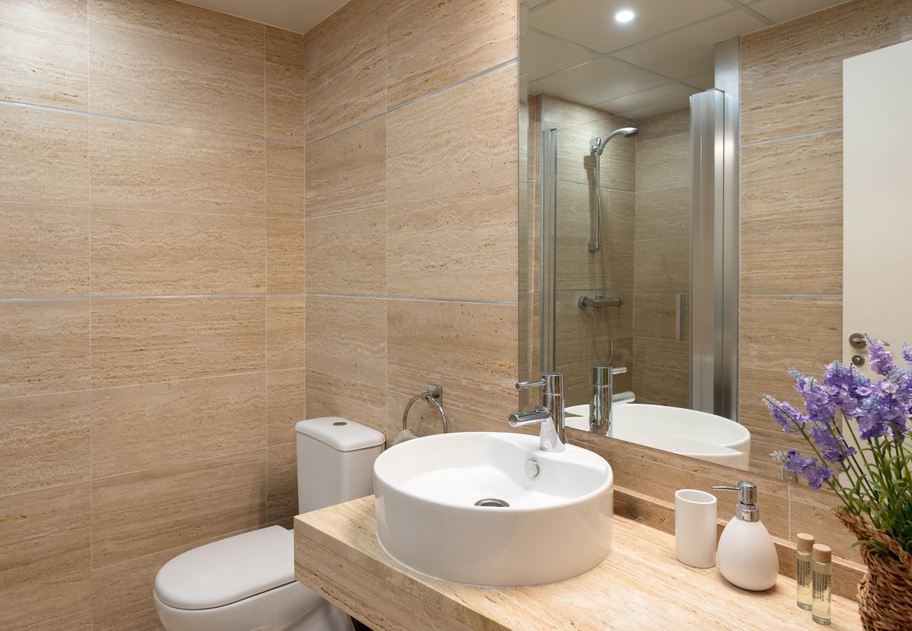 The master bedroom has a king size bed, en-suite bathroom with bath and double sink. The second bedroom offers a double bed and a bathroom with shower. Both bedrooms offer built-in closets and the master bedroom has direct access to the terrace.