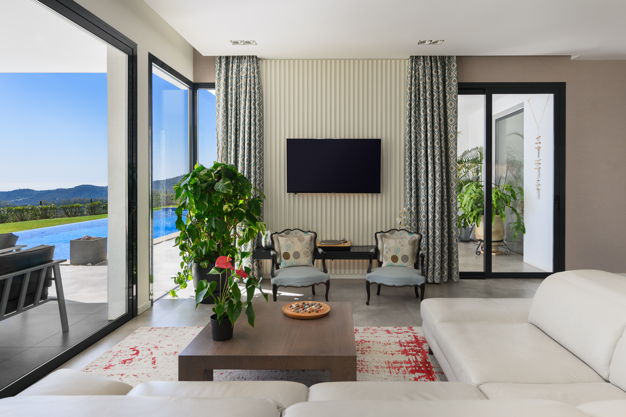 Each bedroom with an ensuite bathroom is a peaceful sanctuary, with sea and mountain views that make every morning and evening unforgettable. But the true heart of the villa lies outdoors, the expansive gardens open onto a stunning private pool that invites you to swim under the sky. Sun terraces with loungers and beautifully landscaped greenery create a secluded paradise. The BBQ area and pétanque court add a playful touch for enjoying time with family and friends. Additional features include a fully equipped and open plan kitchen, 50 m long heated pool (extra fee applies), indoor and outdoor parking for three cars, high-speed WiFi, dedicated workspace, sound system and international TV channels.